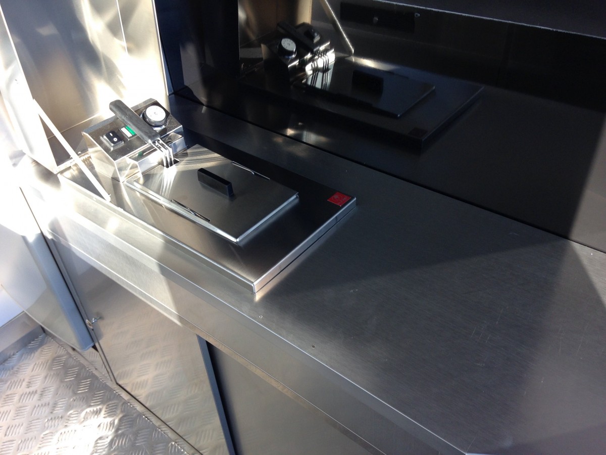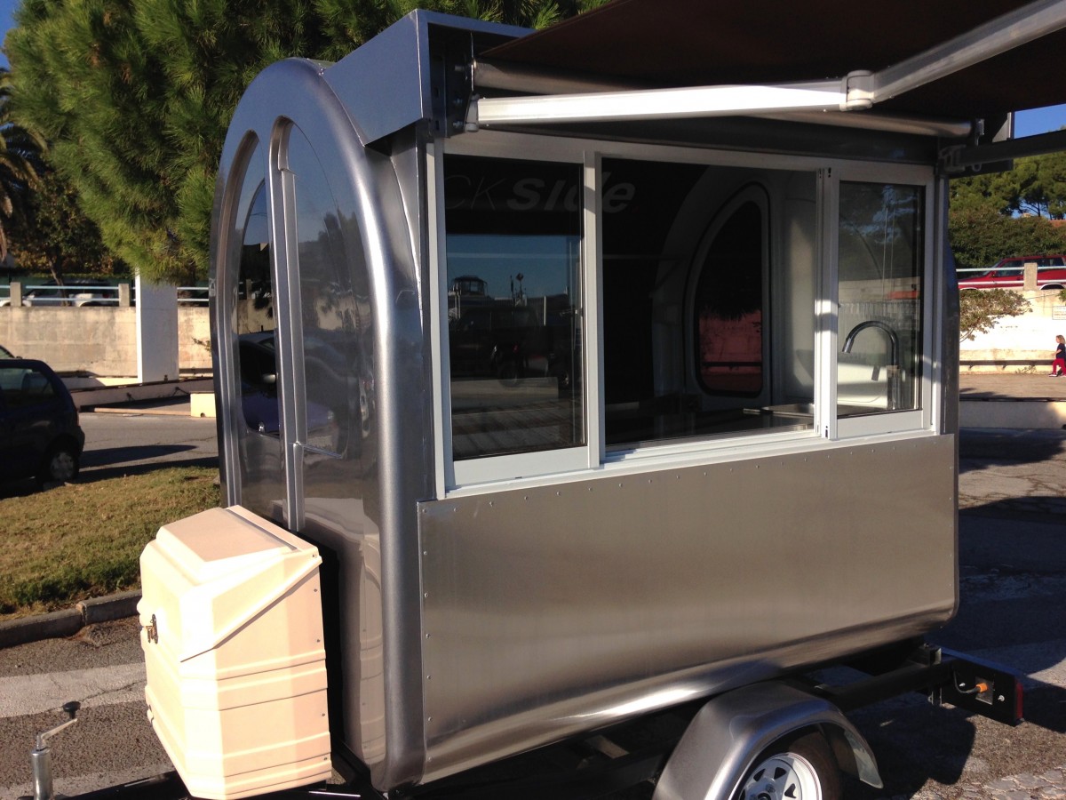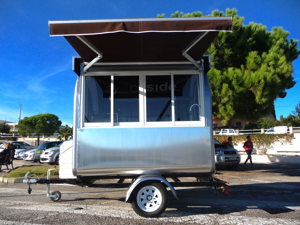 La fabrication d’une remorque food truck pour la ville de Nantes. L’idée étant de fabriquer une remorque food truck, légère et mobile, aux normes alimentaires, qui sorte de l’ordinaire et qui reflète l'activité de vente ambulante snack du client. Cette remorque ambulante compacte est équipée d'une véritable cuisine mobile de type laboratoire pour aller à la rencontre des clients et pratiquer de la restauration mobile et de la vente ambulante avec un confort et un impact en terme de communication sans équivalent. La grande ouverture latérale de type baie vitrée permet un contact direct avec la clientèle. Très pratique pour la communication et la vente. Cela permet également de se protéger des intempéries. Avec une possibilité d'enlever complètement les baies vitrées afin d'obtenir une ouverture franche. Avec cette remorque alimentaire de type snack, le client propose ses spécialités et une cuisine de qualité en ambulant sur les marchés, dans la rue, les salons, les foires, lors d’événements privées…