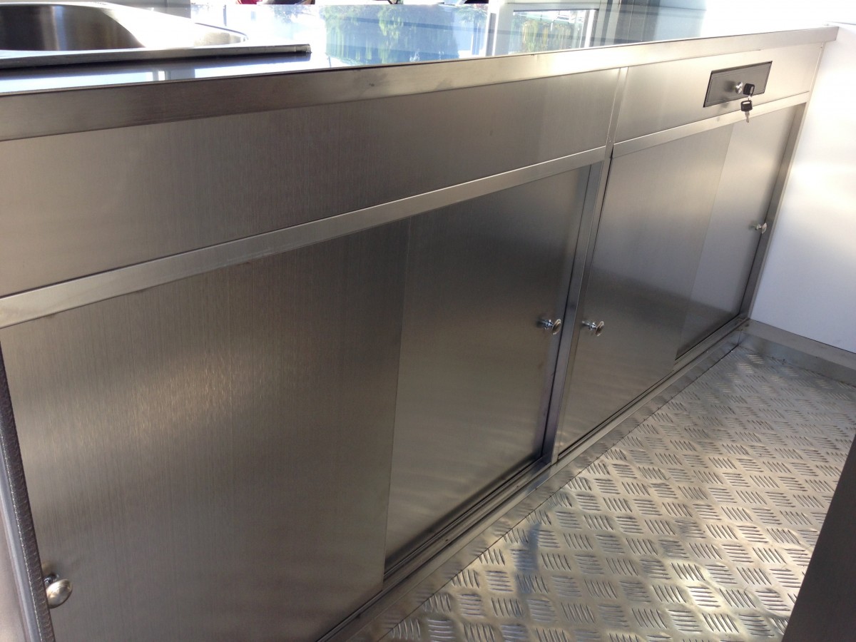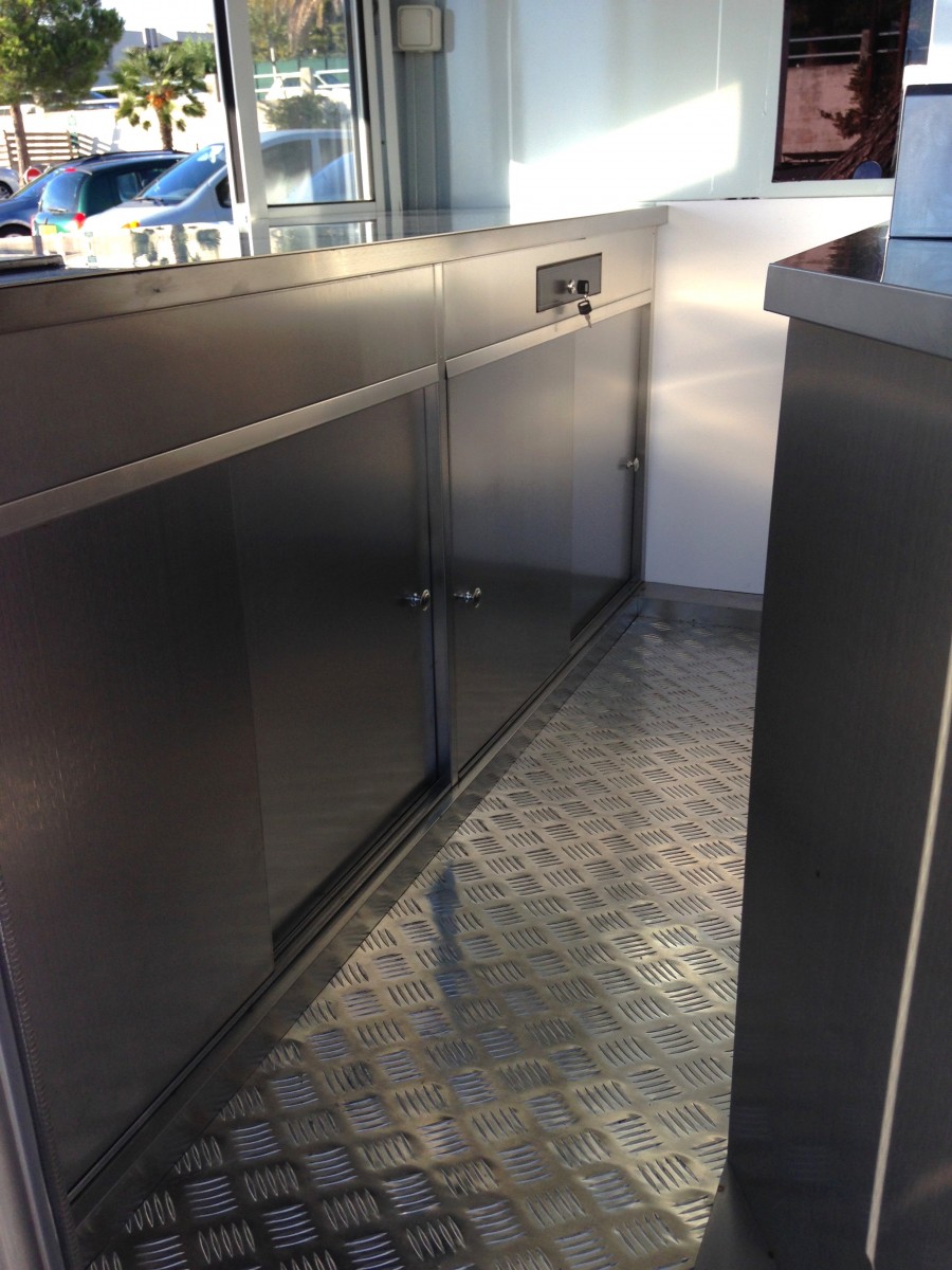 - Nous avons ensuite travaillé à l'aménagement de la cuisine intérieure selon les critères de la cliente : installation des plans de travail en acier inoxydable avec espace de rangement, portes coulissantes, tiroir caisse, électricité, eau, réfrigération, vitrine de présentation produits, étagères, lumières.