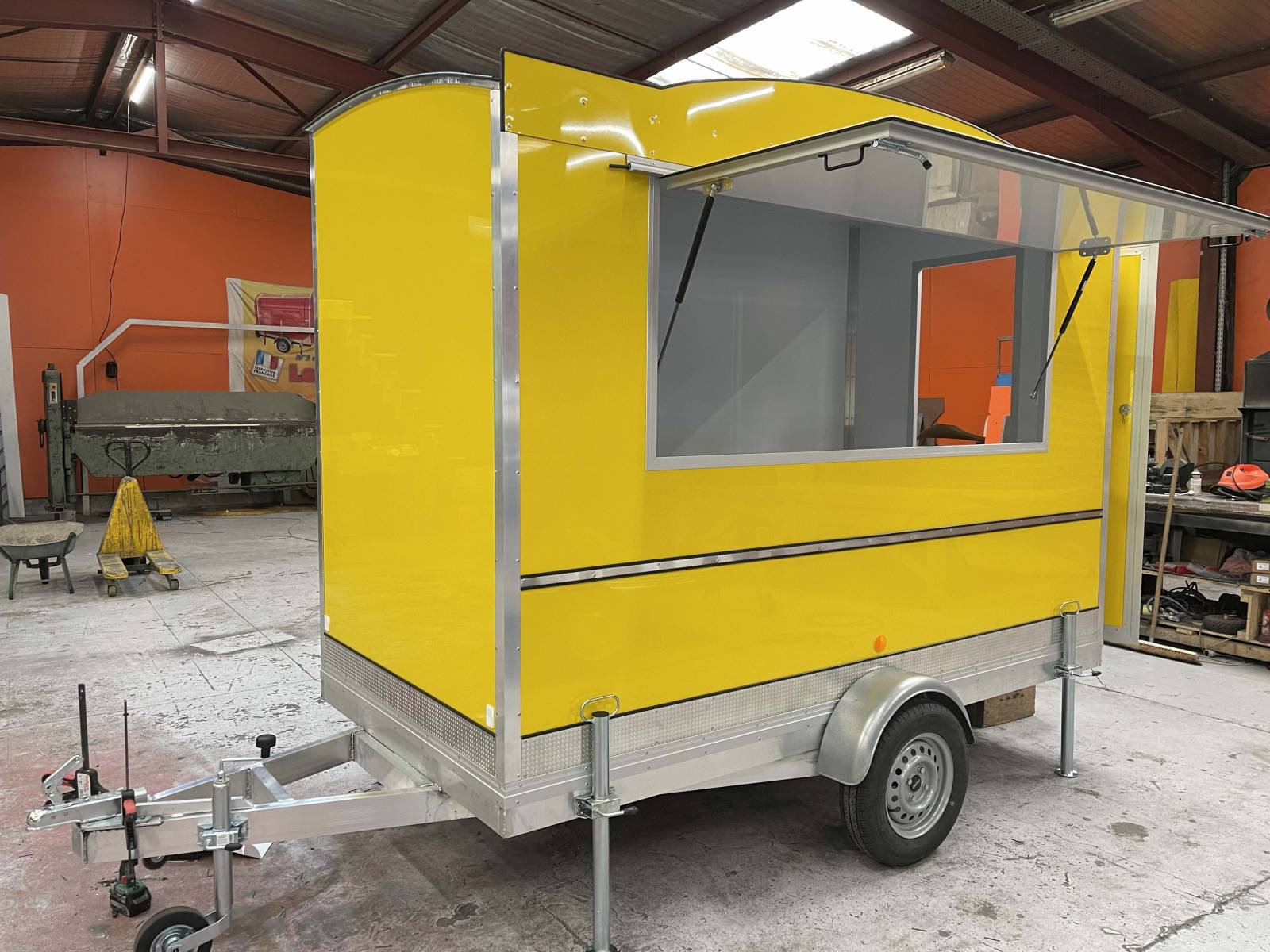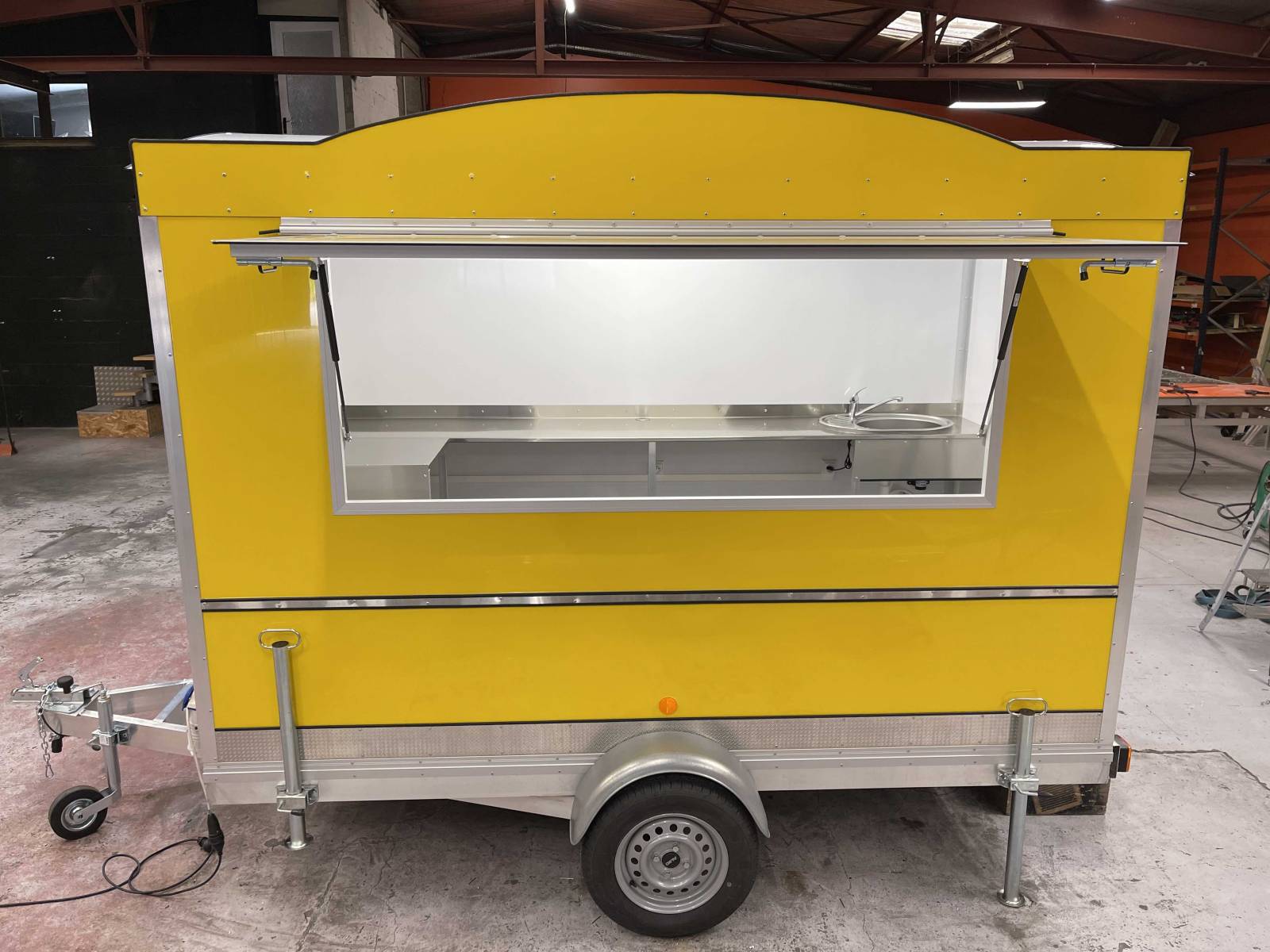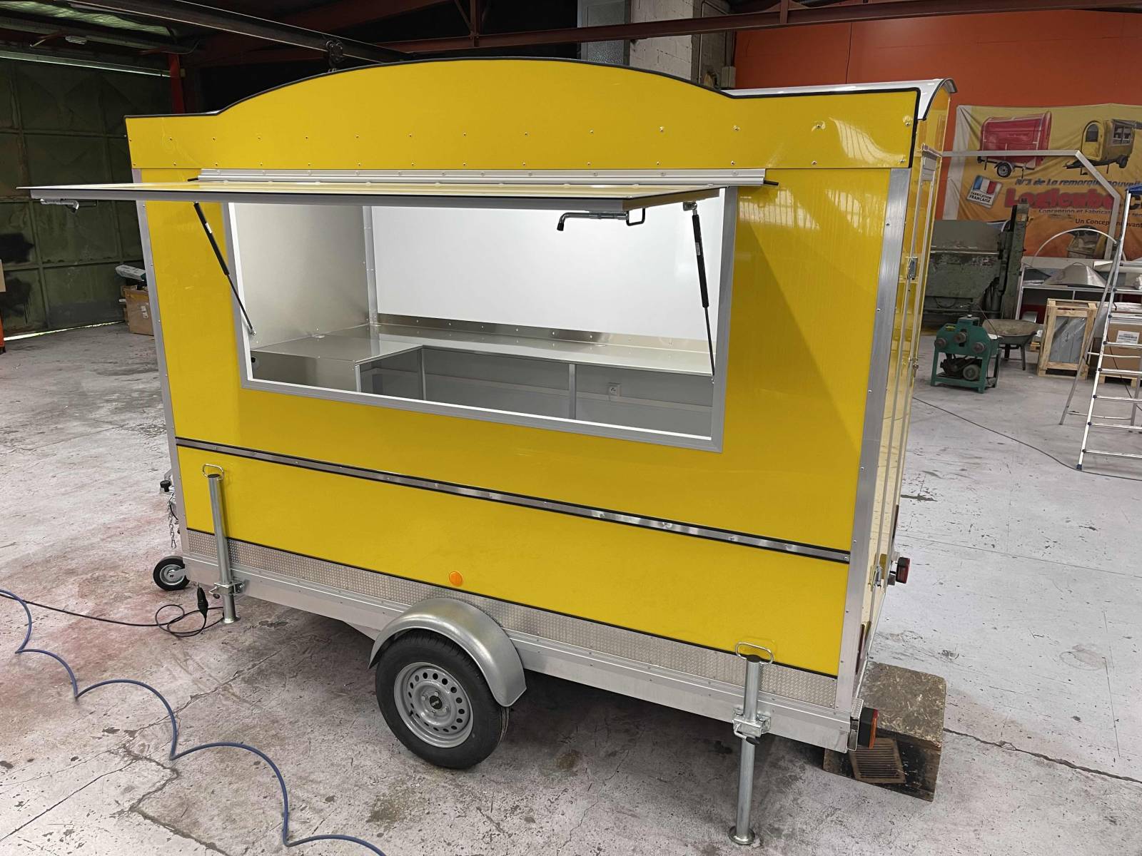 Pour ce projet, nous n’avons pas de demande particulière en terme d’équipements CHR. Le client à souhaité une remorque food truck de couleur jaune avec des plans de travail en acier inoxydable, une crédence inox, l’alimentation électrique, l’alimentation eau, le tout pouvant servir d’espace de préparation et d’espace de vente.