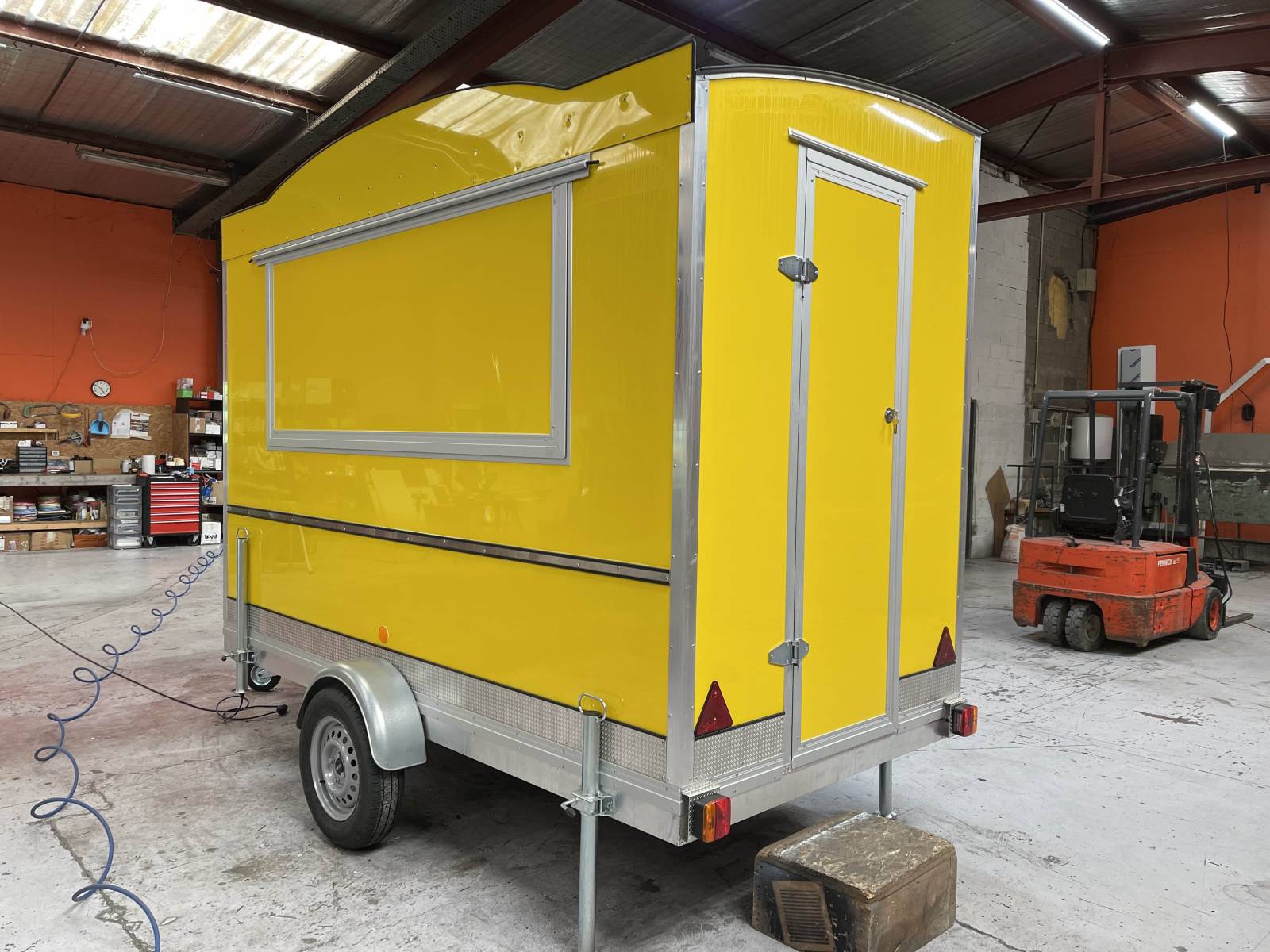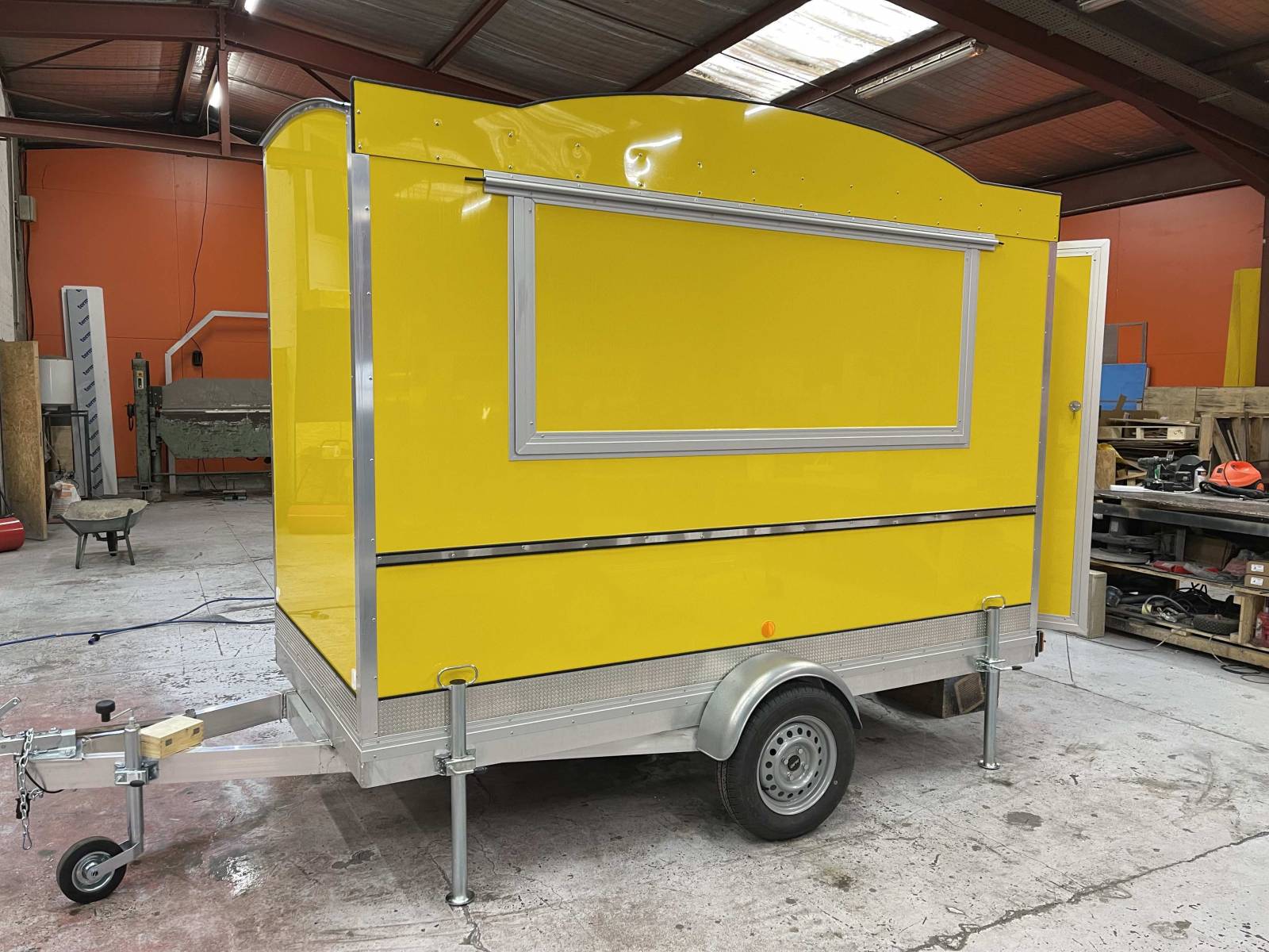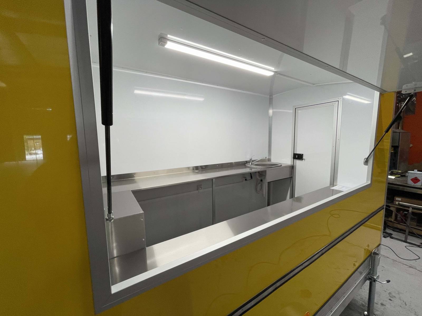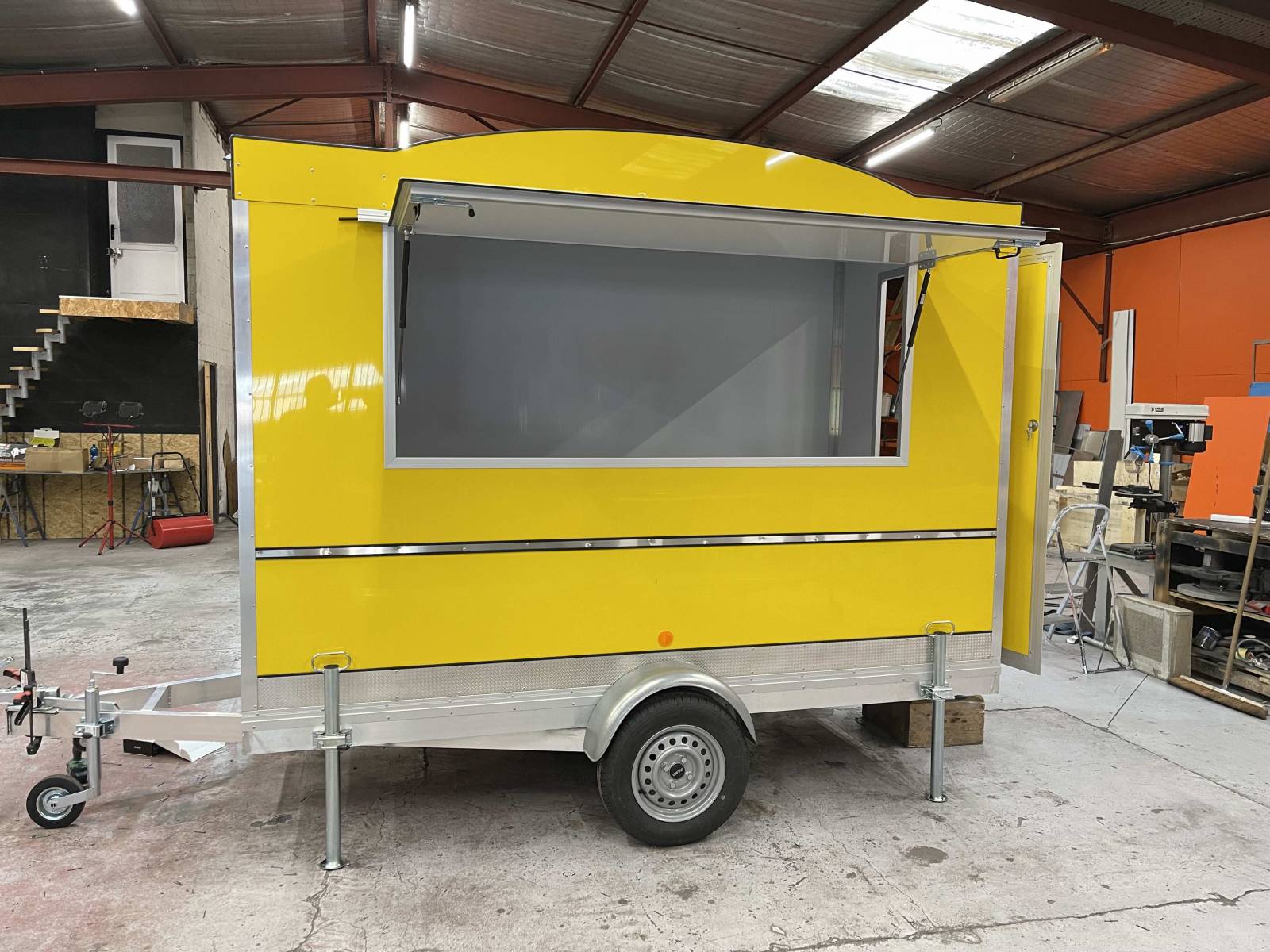 Pour ce projet, nous n’avons pas de demande particulière en terme d’équipements CHR. Le client à souhaité une remorque food truck de couleur jaune avec des plans de travail en acier inoxydable, une crédence inox, l’alimentation électrique, l’alimentation eau, le tout pouvant servir d’espace de préparation et d’espace de vente.