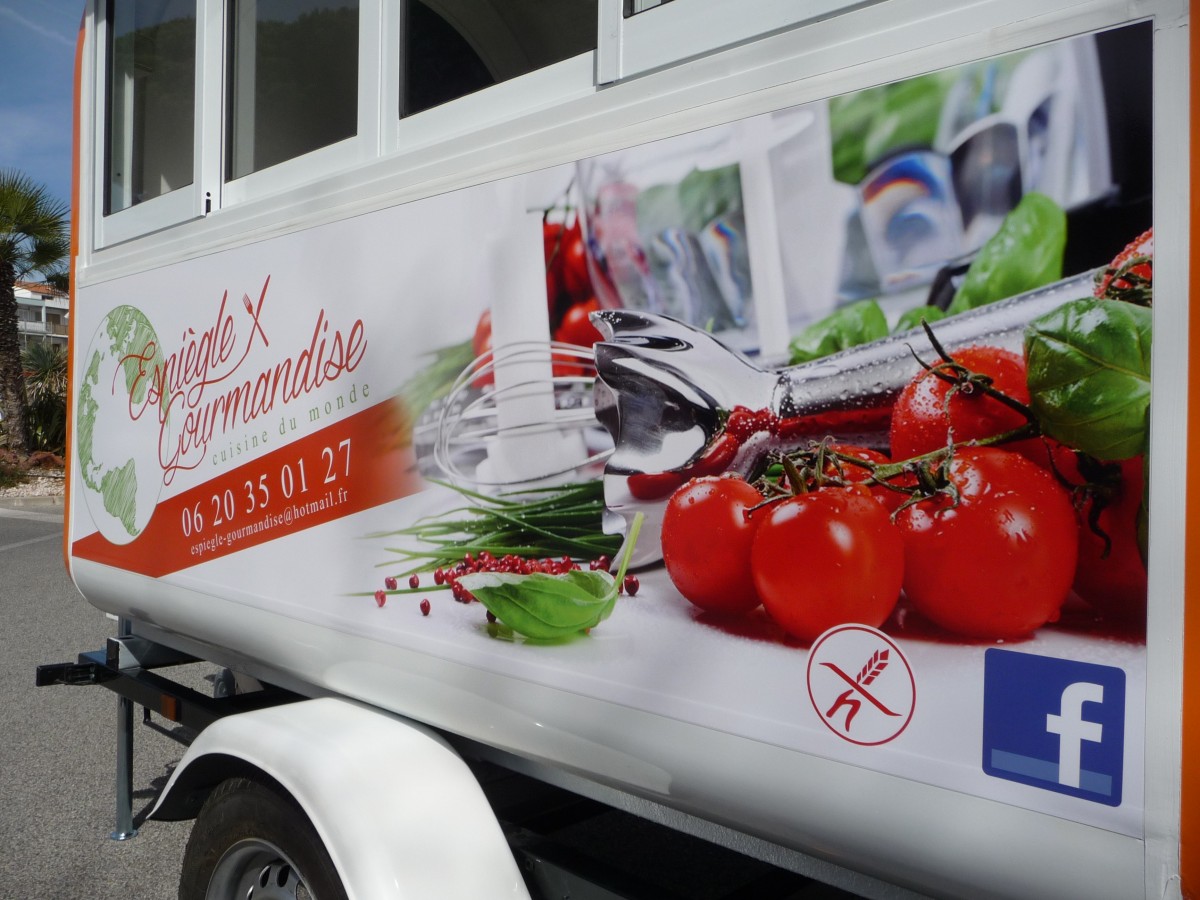 La fabrication d’une remorque food truck pour la ville de Marseille. L’idée étant de fabriquer un camion food truck, léger et mobile, aux normes alimentaires, qui sorte de l’ordinaire et qui reflète l'activité traiteur du client. Cette remorque ambulante compacte est équipée d'une véritable cuisine mobile pour aller à la rencontre des clients et pratiquer de la vente ambulante avec un confort et un impact en terme de communication sans équivalent. Les baies vitrées coulissantes permettent à la fois d'être en contact direct avec les clients mais aussi d'être correctement abrité à l'intérieur de la remorque. Avec cette remorque Street Food de type snack traiteur, la cliente propose aujourd’hui ses spécialités et sa cuisine en mode ambulant sur les marchés, dans la rue, les salons, les foires, lors d’événements privées… La conception de cette mini remorque snack a été réalisé dans les usines de Kiosque prime en France.
