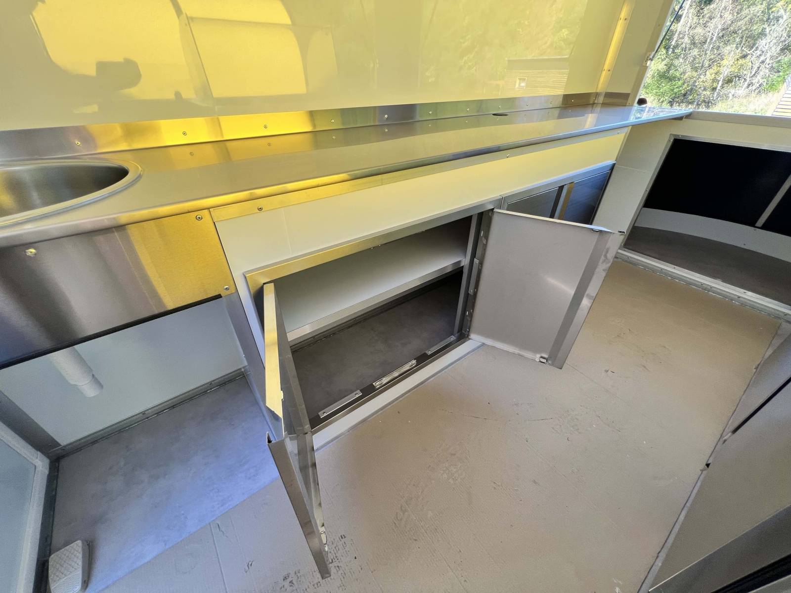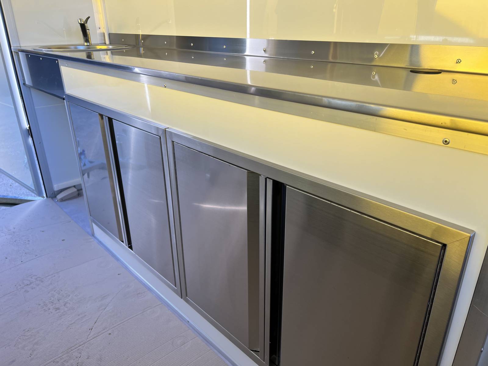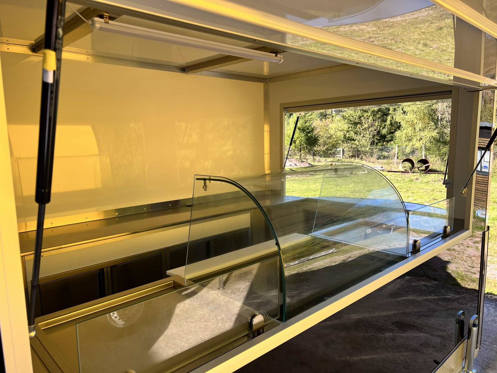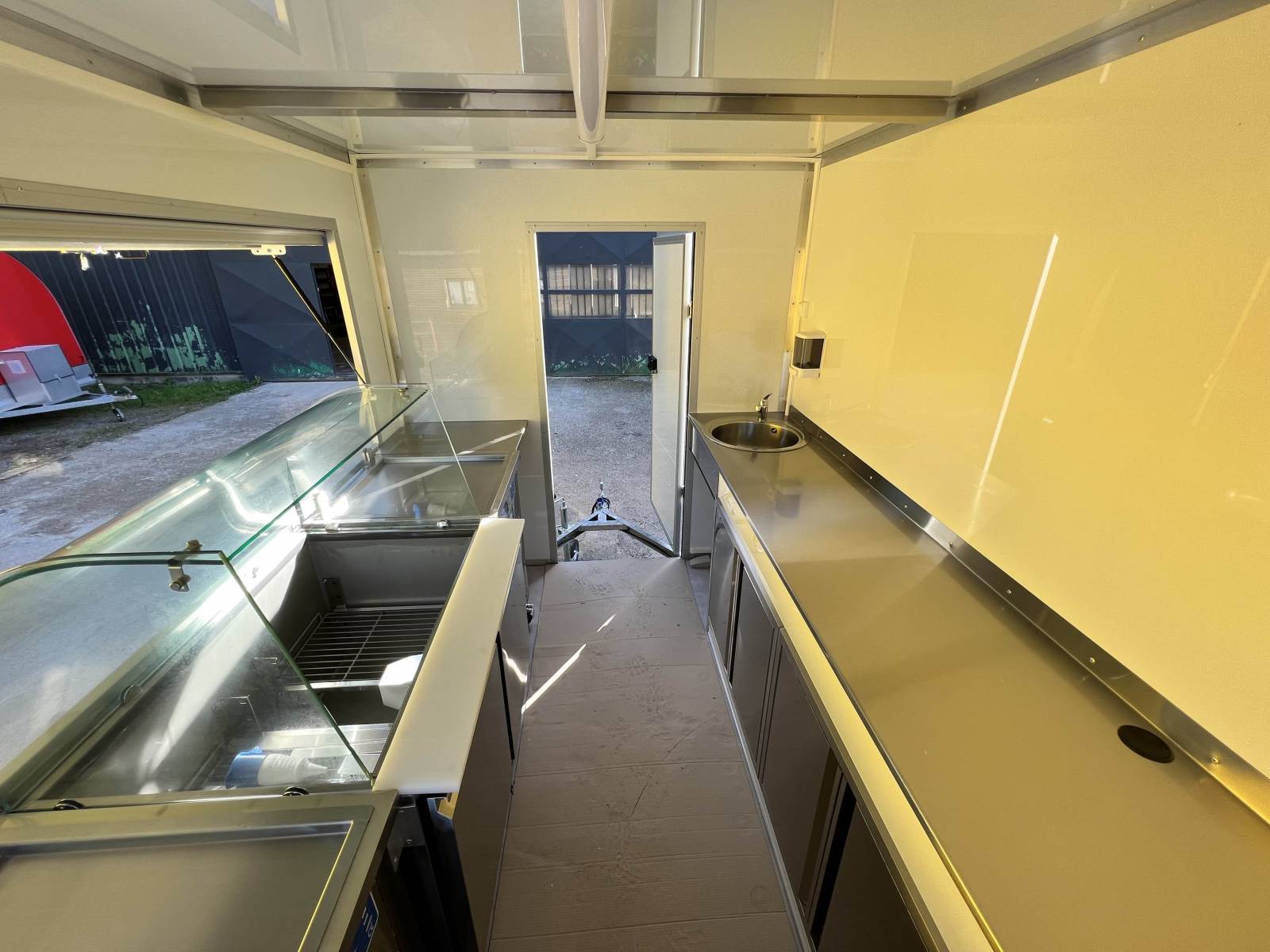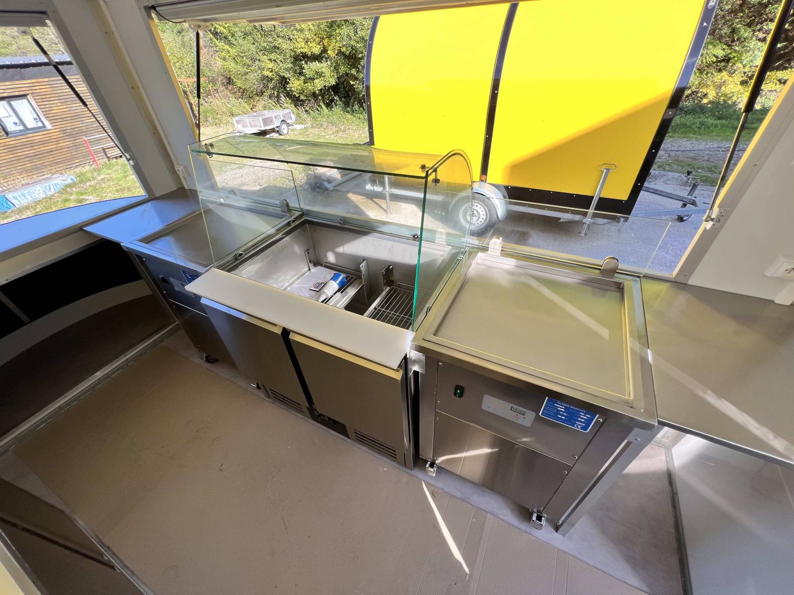 - Un agencement intérieur et installons des équipements sur-mesure (Alimentation électrique, Alimentation eau, lumière, plan de travail en acier inoxydable, saladette et table froide 2 portes, 2 machines à glace à la plancha, sol anti dérapant, hayon principale et hayon latérale. Sans oublier la couleur (intérieur blanc et exterieur noir).