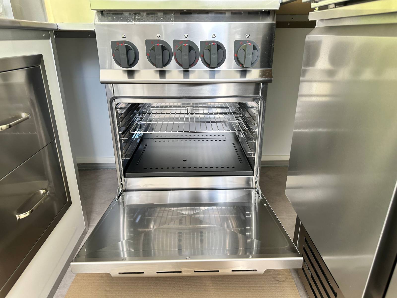 ETAPE 5: Installation des équipements CHR et autres options sur-mesure (crédence inox, étagères inox, placards inox, tiroirs inox, table froide 2 portes, gazière four 4 feux, hotte pro inox, plonge, distributeur de savon…)