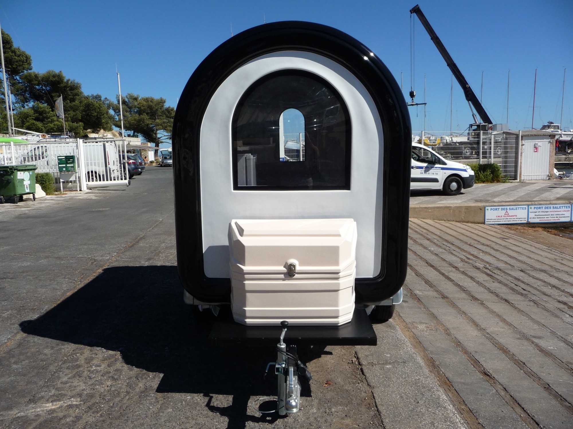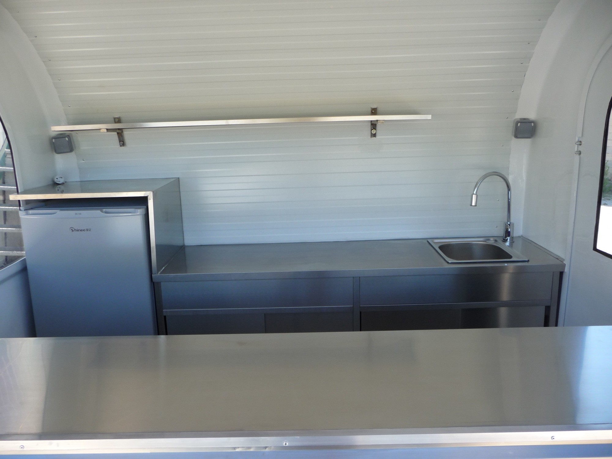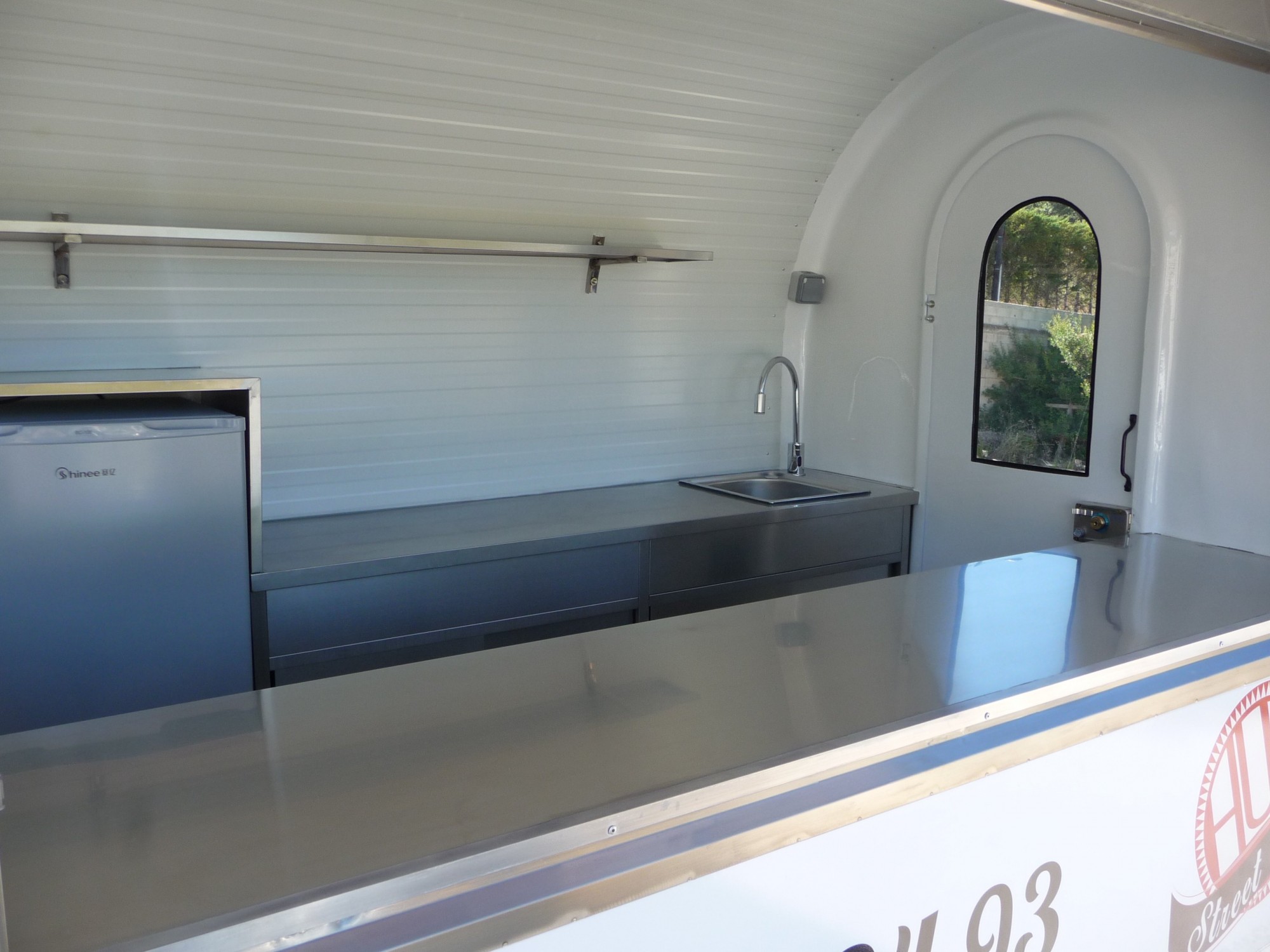 Avec cette remorque Street Food de type snack ambulant, le client propose aujourd’hui ses spécialités et sa cuisine en mode ambulant sur les marchés, dans la rue, les salons, les foires, lors d’événements privées… La conception de cette mini remorque snack a été réalisé dans les usines de Kiosque prime en France.