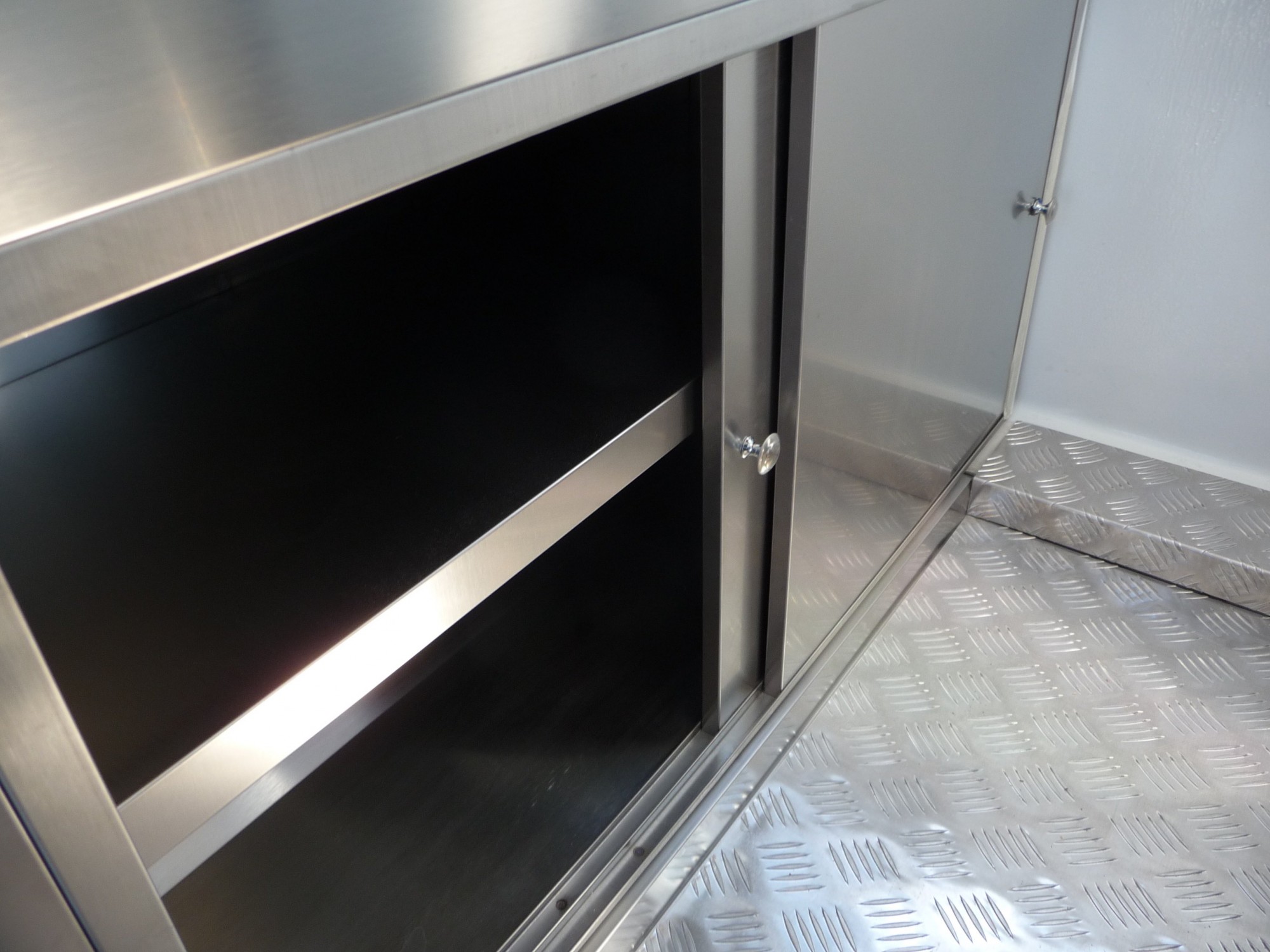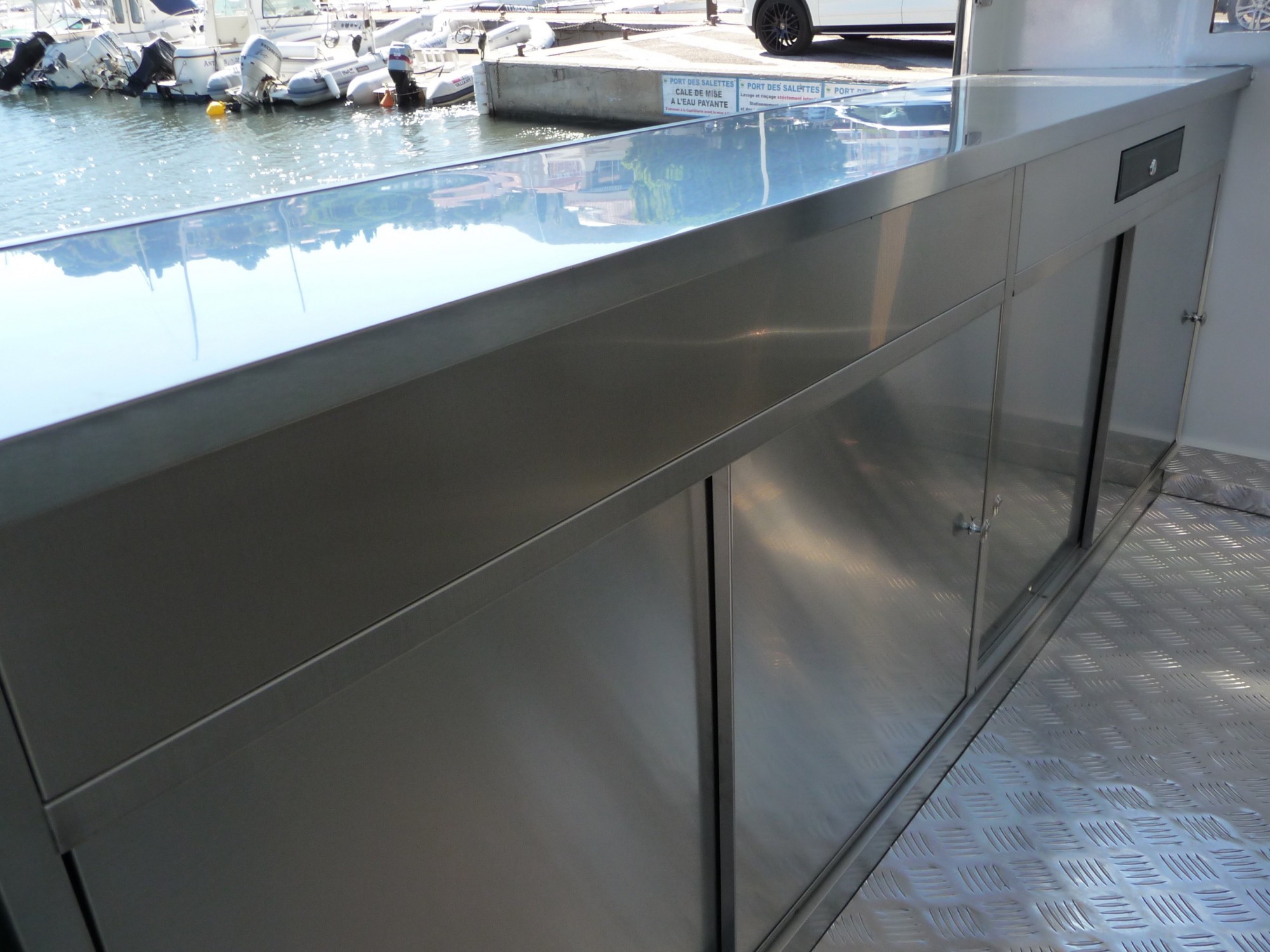 - Nous avons ensuite travaillé à l'aménagement de la cuisine intérieure selon les critères de la cliente : installation des plans de travail en acier inoxydable avec espace de rangement, portes coulissantes, tiroir caisse, électricité, eau, réfrigération, vitrine de présentation produits, étagères, lumières.