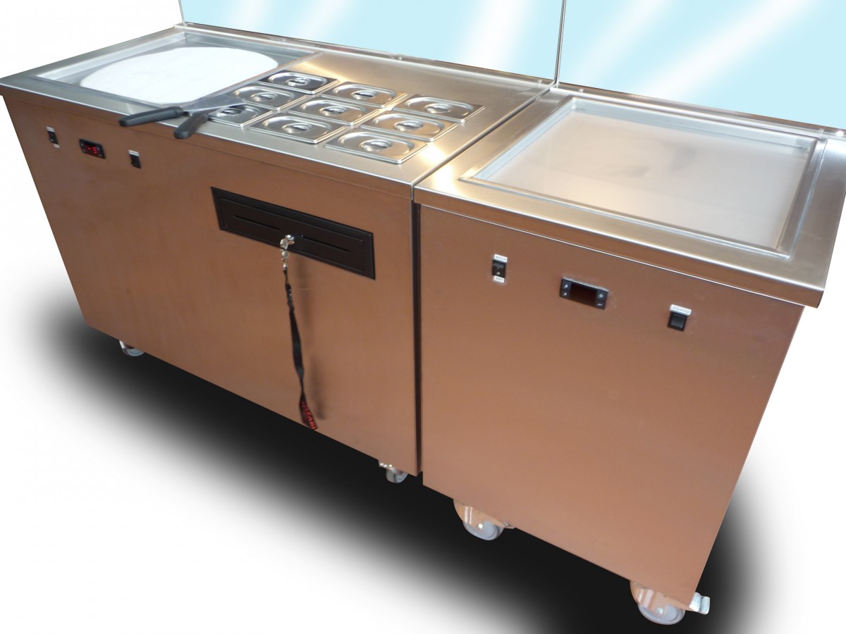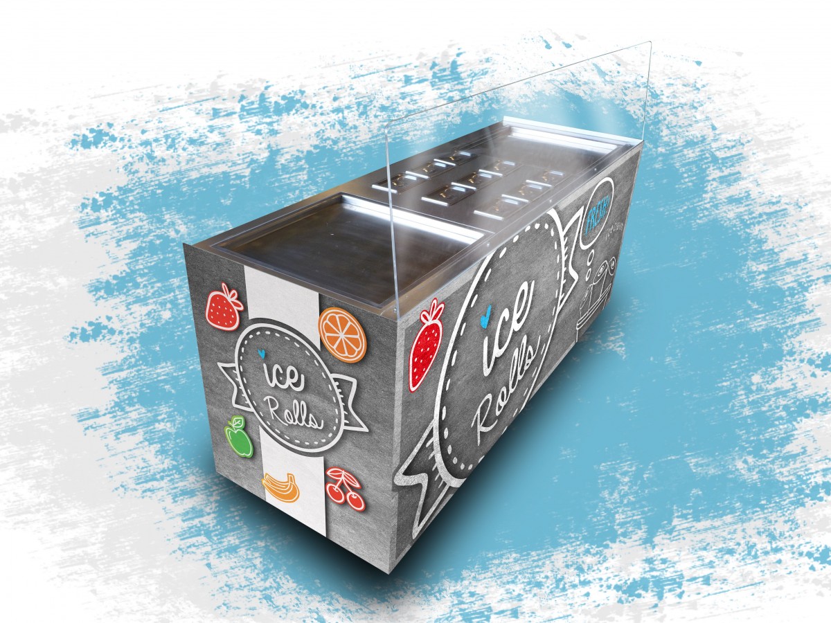 Ce module, réfrigéré, pour les glaces en rouleaux, bénéficie, en plus des deux plaques froides grand format, d'un plan de travail avec espace de stockage et de vitres plexi avec retour (très pratique lors du service).