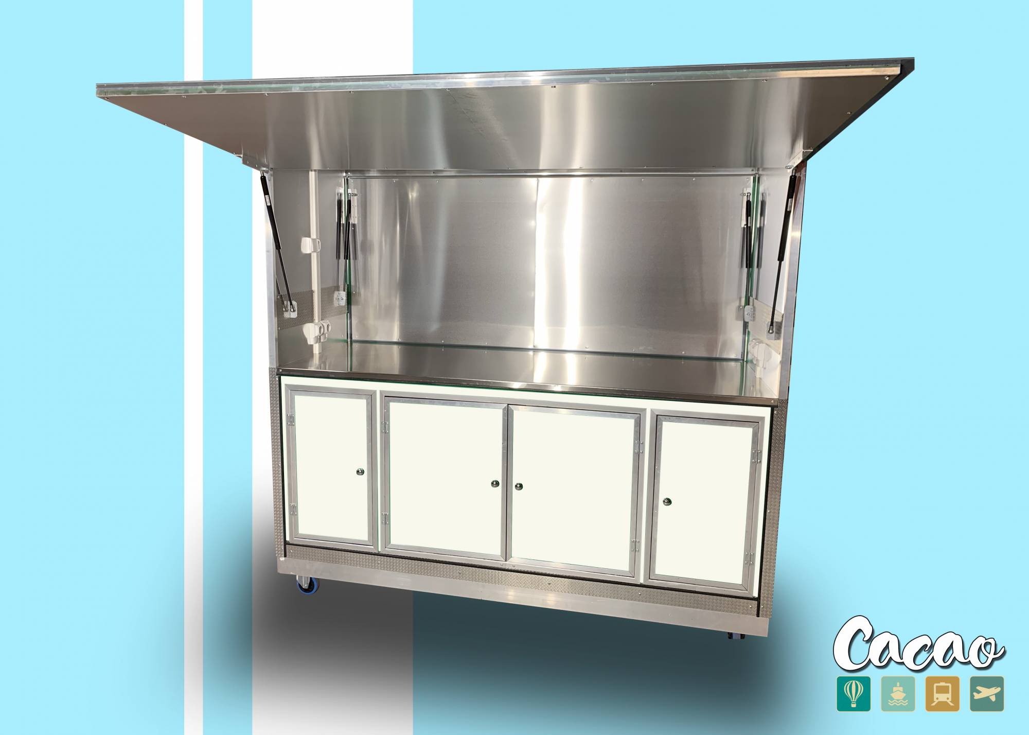 Ce mini kiosque ambulant est équipé d'un grand plan de travail en acier inoxydable avec espace de rangement sous plan. Il bénéficie de 2 grandes ouvertures latérales sur hayon pour une parfaite visibilité des produits tout au long de l'activité.