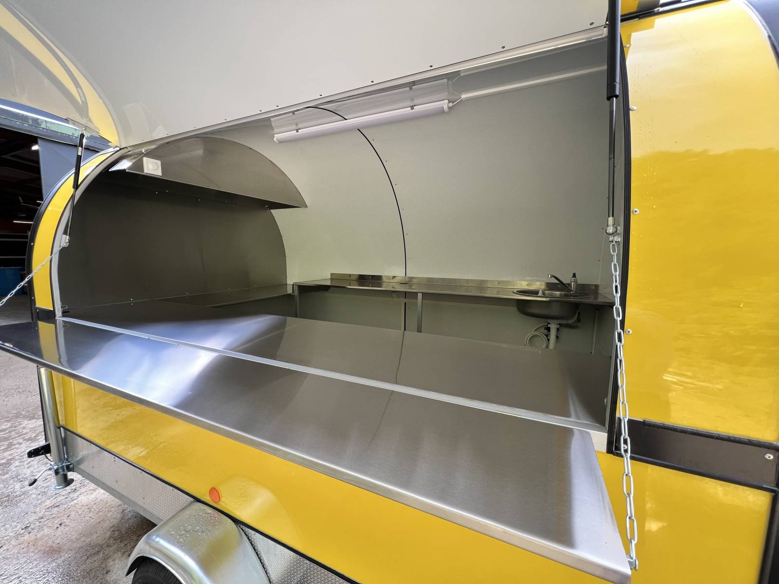 Dans ce post nous vous présentons la fabrication d'un foodtruck standard de couleur jaune. Equipement intérieur: Plan de travail en inox, hotte, lumière, eau, électricité.
