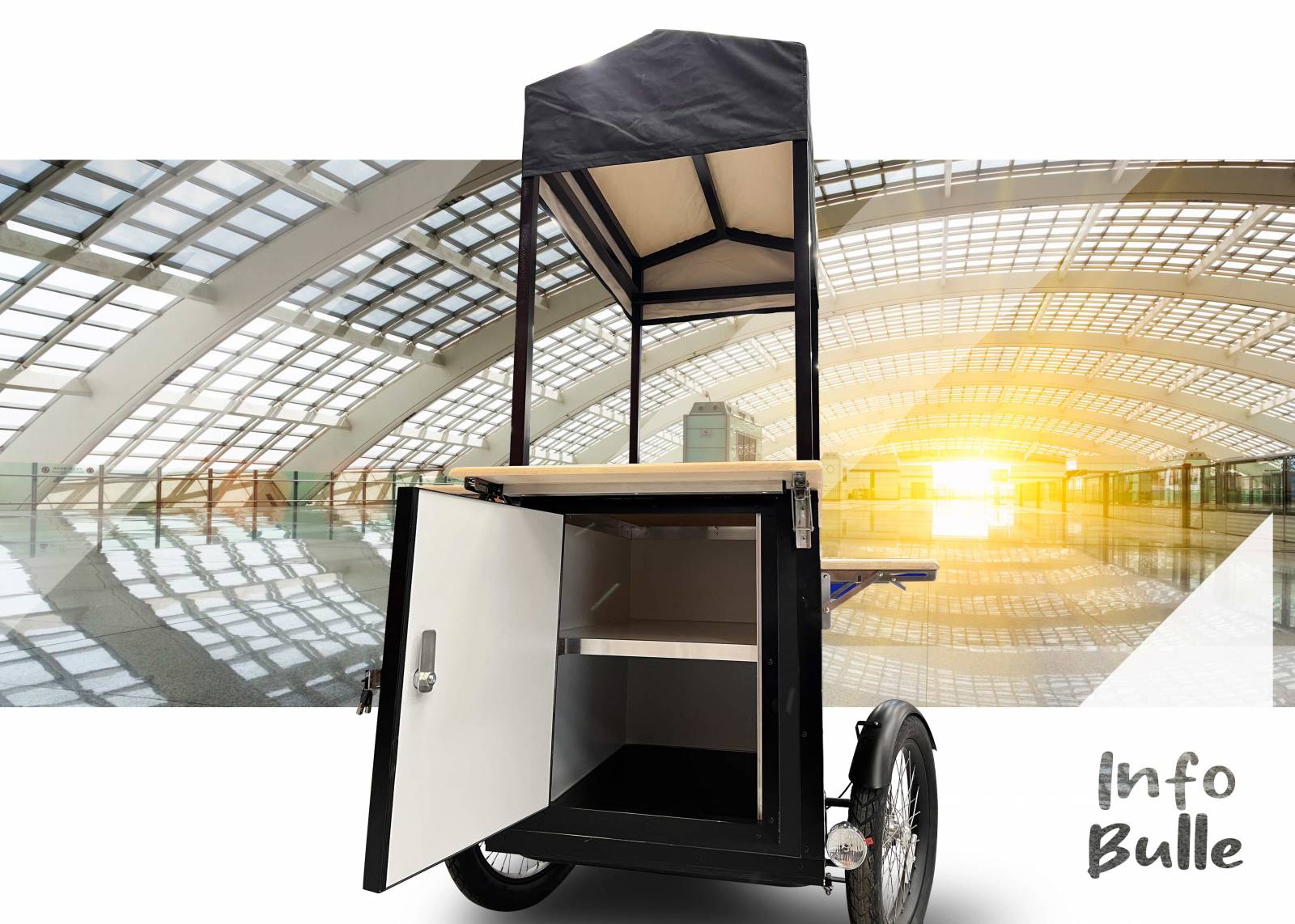 Le triporteur info Bulle c’est quoi ? C’est un vélo Triporteur électrique créé pour les actions d'information, d'accueil et de Street marketing. C'est un kiosque d’information nomade. Ce vélo triporteur électrique info Bulle est totalement personnalisable, écologique et bénéficie d’un très gros capital sympathie. Le street marketing représente un ensemble de différentes techniques de communication publicitaire directe. Le vélo triporteur info Bulle destiné aux actions de street marketing permet de s'adresser directement aux consommateurs dans leur quotidien. Ce vélo triporteur publicitaire peut s’adresser à une clientèle assez large (office du tourisme, mairie, marque, promoteur immobilier, association, partie politique, université…).