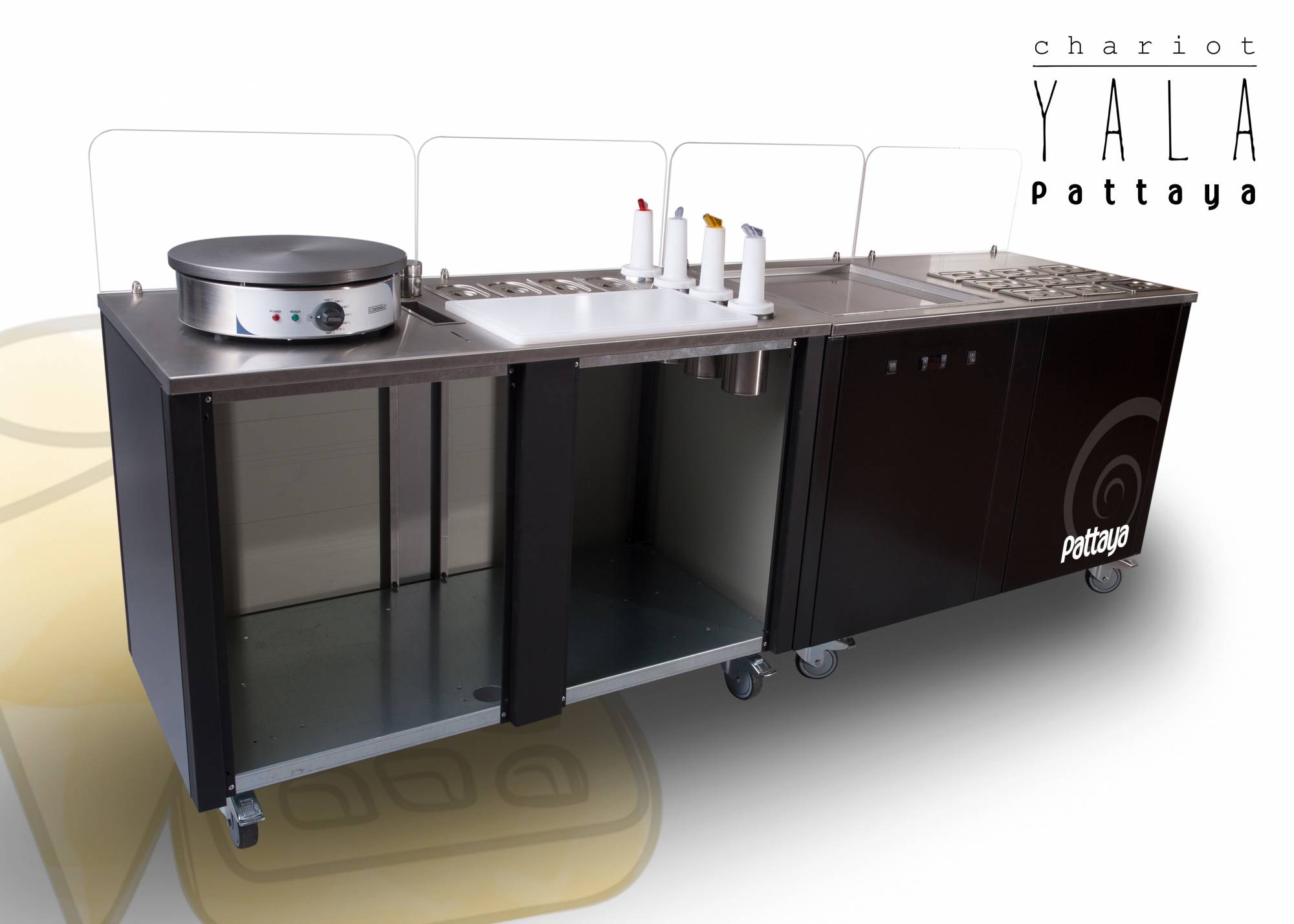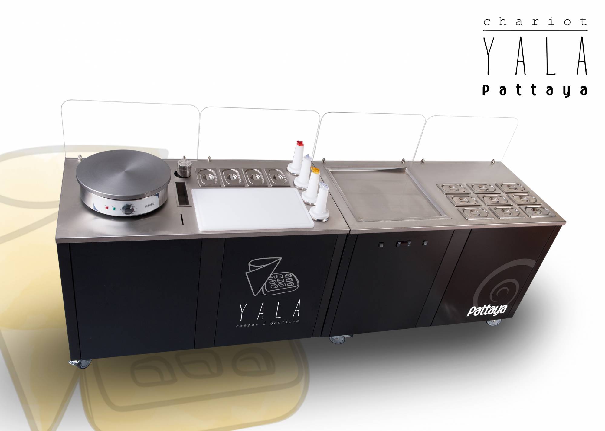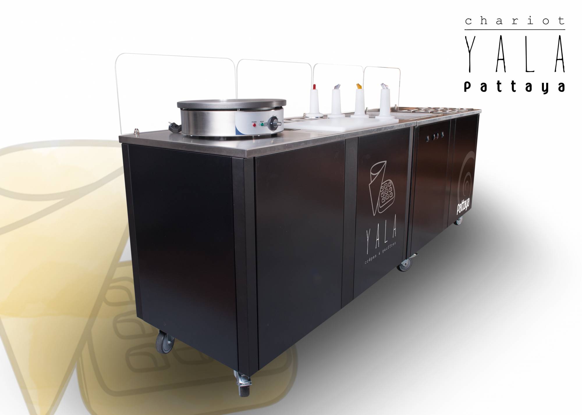 Une combinaison de 2 chariots ambulants spécialement conçus pour les Crêpes, Gaufres & Ice cream roll. Ces modules ambulants ultra design, pratiques et passe-partout peuvent être liés ou pas (système de fixation aimanté). Avec le chariot YALA - P, distinguez vous et créez l'événement ! Ce module de 2 chariots ambulants est étudié pour la fabrication et la vente de crêpes, Gaufres, Waffle bubble et ice cream roll.