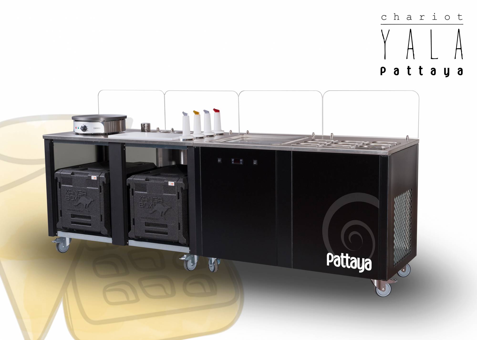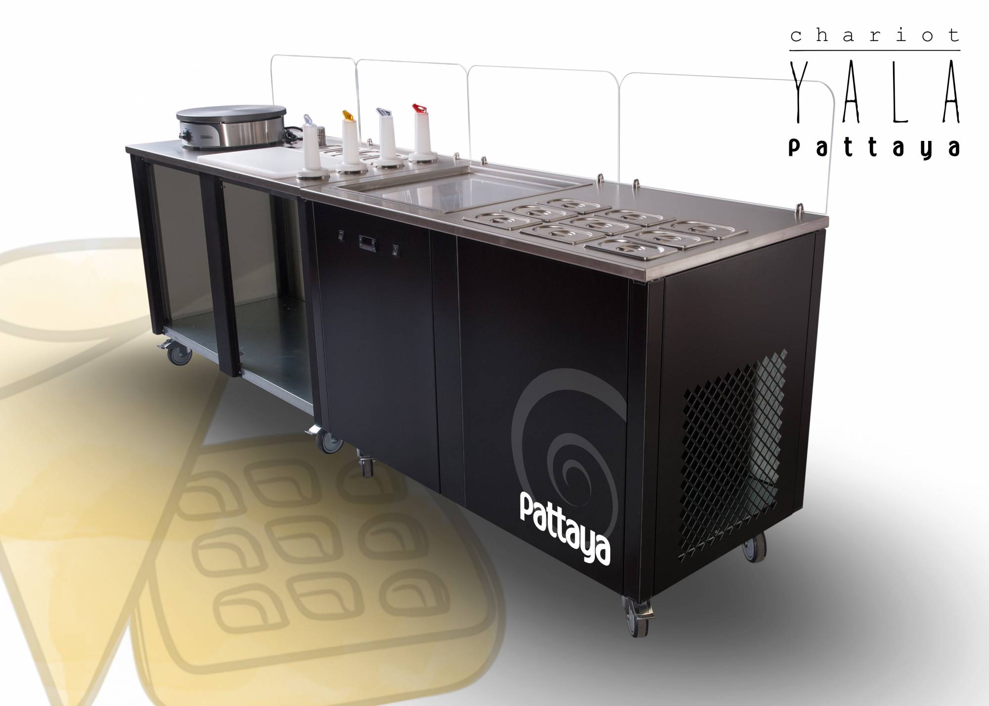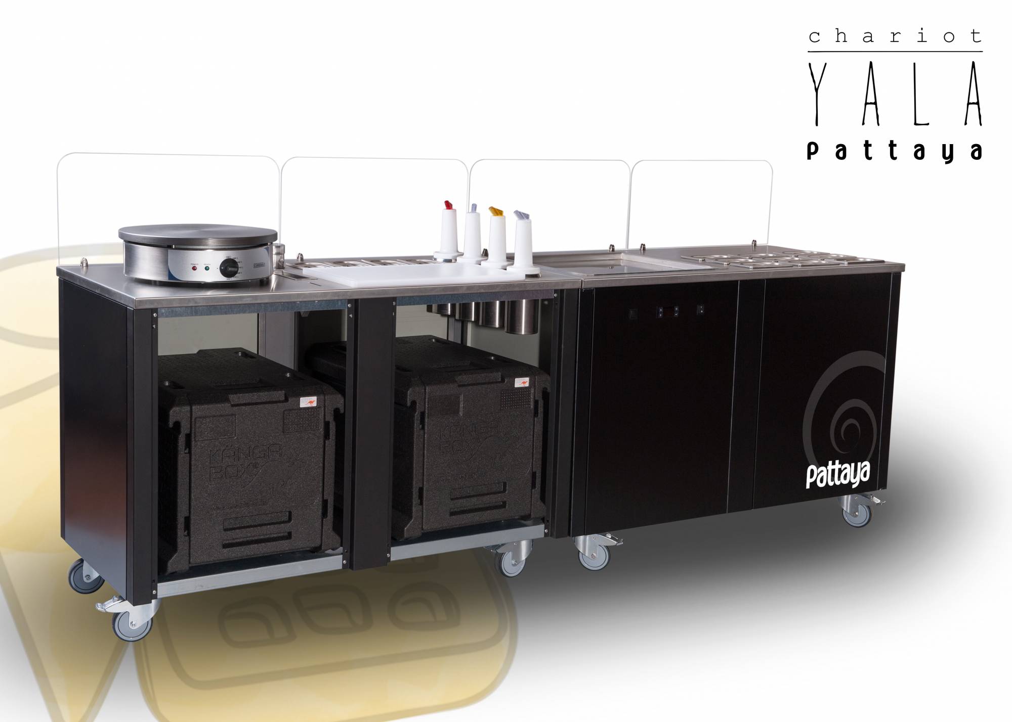 Une combinaison de 2 chariots ambulants spécialement conçus pour les Crêpes, Gaufres & Ice cream roll. Ces modules ambulants ultra design, pratiques et passe-partout peuvent être liés ou pas (système de fixation aimanté). Avec le chariot YALA - P, distinguez vous et créez l'événement ! Ce module de 2 chariots ambulants est étudié pour la fabrication et la vente de crêpes, Gaufres, Waffle bubble et ice cream roll.