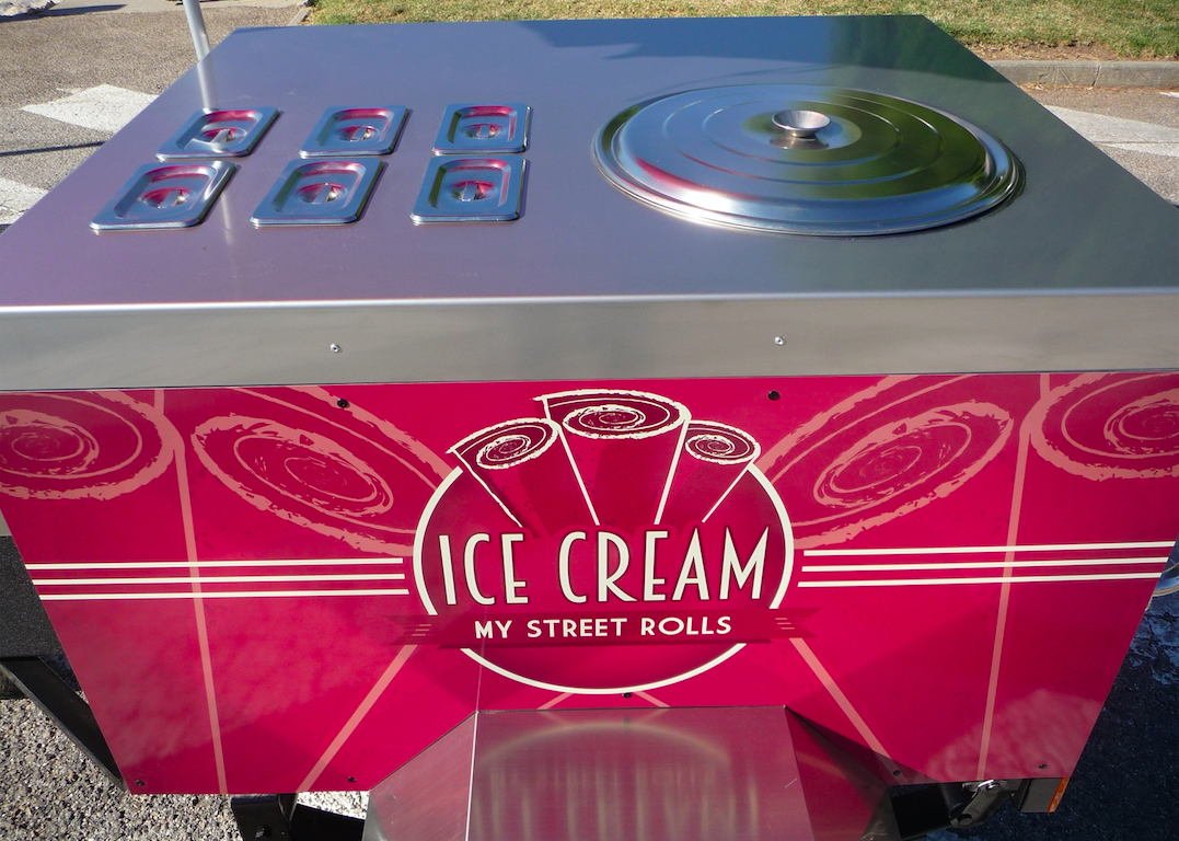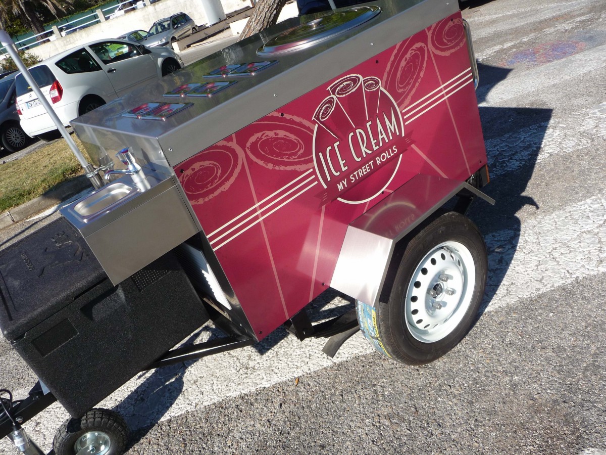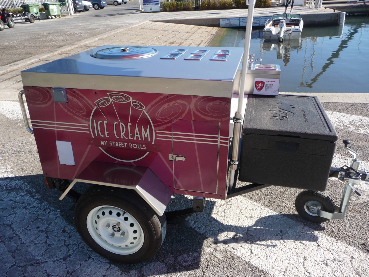 C'est mobile, design, simple, efficace et spécialement conçu pour la préparation de Ice-Cream Roll. Le chariot ICE-CREAM ROLL est tractable. Équipé d'une machine avec plaque givrante, d'un châssis roulant et d'un timon pour vous déplacer à pied comme avec votre véhicule. Parfait pour la mise en avant de votre marque, pour la préparation et la vente de vos créations glacées. Utile en intérieur comme en extérieur, ce chariot est conçu spécialement pour vous. Une personnalisation et un design unique pour une identité plus forte. Boostez votre visibilité sur les marchés, les salons, les foires, dans la rue, les plages, devant votre enseigne, dans votre restaurant... Versez votre crème glacée sur la plaque givrante et ajoutez ce qui vous semble bon ! Fruits, légumes, biscuits, chocolats, gâteaux, bonbons, nappages, épices, toppings, salé, sucré... Une animation qui sort du commun et une mise en bouche juste délicieuse ! L'Ice-Cream Roll est bien plus qu'une tendance, c'est un nouveau mode de fabrication et de consommation de produits glacés.