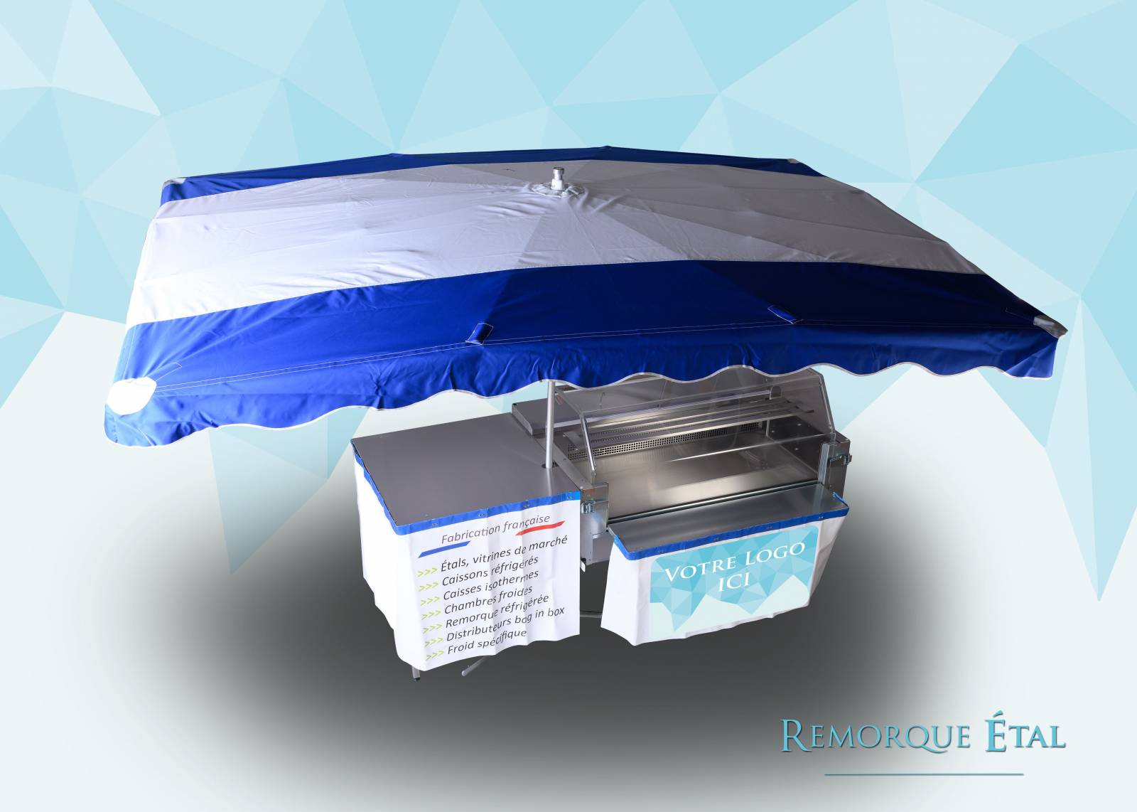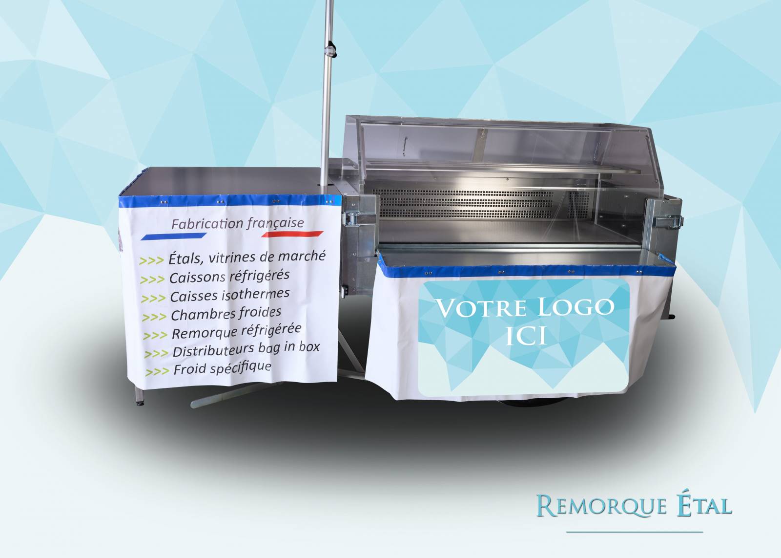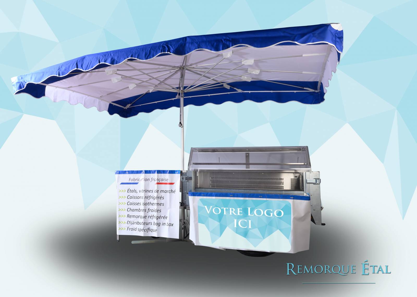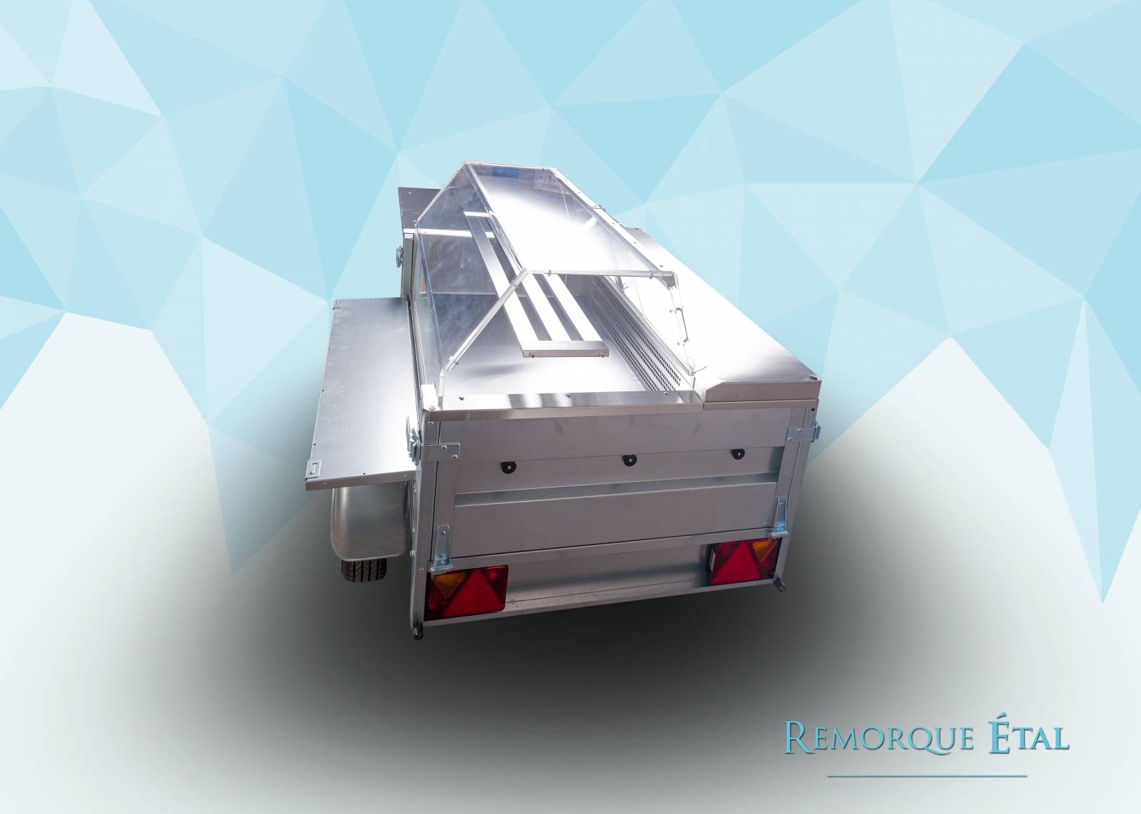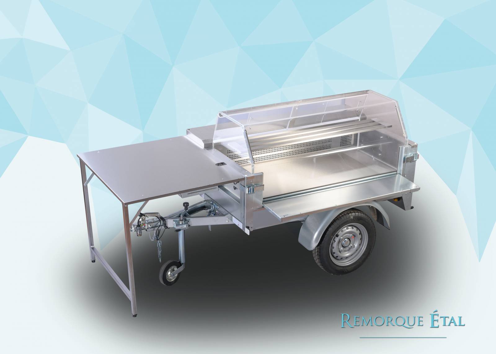 La remorque ETAL DE MARCHÉ ambulante est une vitrine réfrigérée fixée sur un châssis roulant de remorque destinée à la vente de produits frais sur les marchés. La remorque étal est équipée avec une vitrine froide de 480 litres pour le stockage et la présentation de vos produits frais. Elle représente une excellente solution pour la mise en place facile et rapide sur le lieu de vente et pour la mise en valeur de vos produits. Les vitrines froides sont équipées d'un groupe frigorifique statique brassé haut de gamme, fabriquée en France. Idéal pour le transport, le capotage du groupe est spécialement étudié pour protéger l'équipement des secousses liées à la route. L’affichage digital de la température, réglable à l’intérieur et à l’extérieur de la vitrine, à la vue des clients pour un gage de qualité et de fraîcheur des produits exposés.